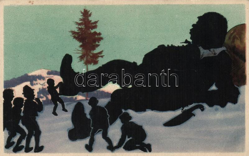 Leírás: Humour, Giant man, silhouette, Wenau-Brabant card, litho (EK)