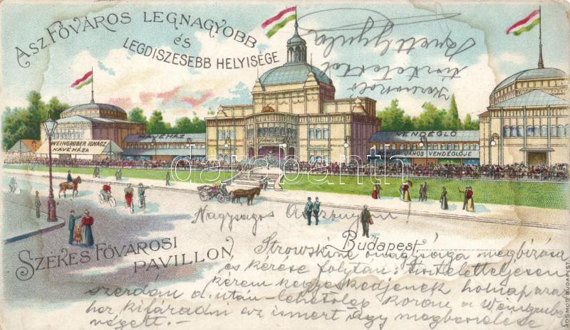 Leírás: 1899 Budapest XIV. Székesfővárosi Pavilon, Bokor János vendéglője, Weingruber Ignác kávéháza, litho (ragasztónyom / gluemark) (small tear)