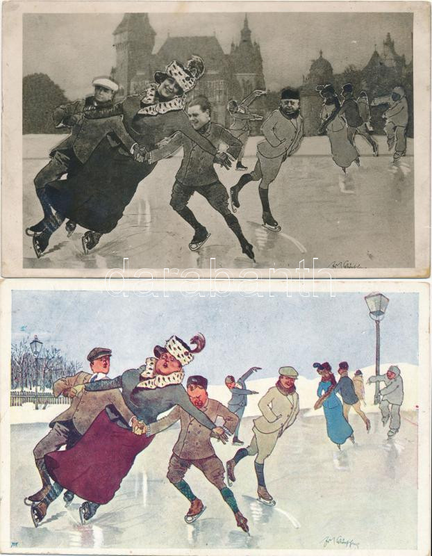 Budapest XIV. Városligeti műjégpálya + a fotómontázshoz szolgáló eredeti Schönpflug művészlap / an original Schönpflug postcard + a funny Hungarian photo collage postard