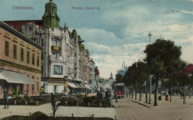 Leírás: Debrecen Ferenc József út, Tóth Gyula vas-, fém- és szerszámüzlete, Kontsek Kornél üzlete, villamos (kis szakadás / small tear)