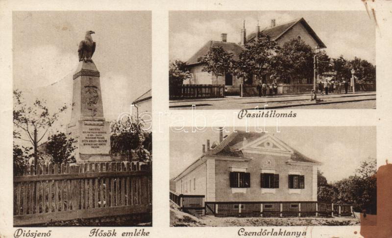 Leírás: Diósjenő vasútállomás, csendőrlaktanya, Hősök emléke (fl)