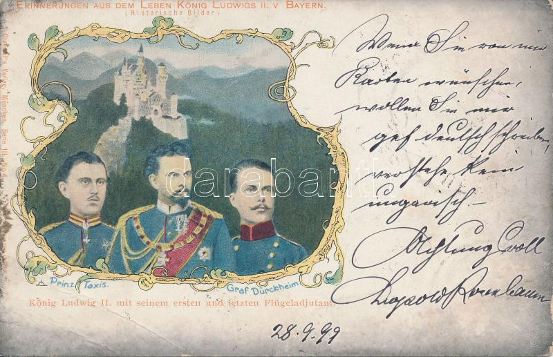 1899 Ludwig II of Bavaria, Prinz Taxis, Graf Dürckheim, article on the... https://www.darabanth.com/hu/203-Gyorsarveres/203.0/Kepeslapok/Uralkodo-Politikus~600400/1899-Ludwig-II-of-Bavaria-Prinz-Taxis-Graf-Durckheim-article-on-the-back-side-Art-Nouveau~II807151