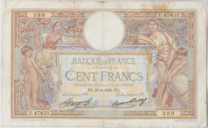 Leírás: Franciaország 1935. 100Fr T:III,III- ragasztott
