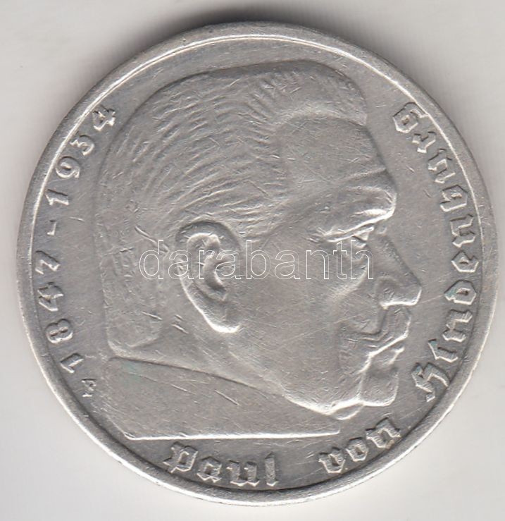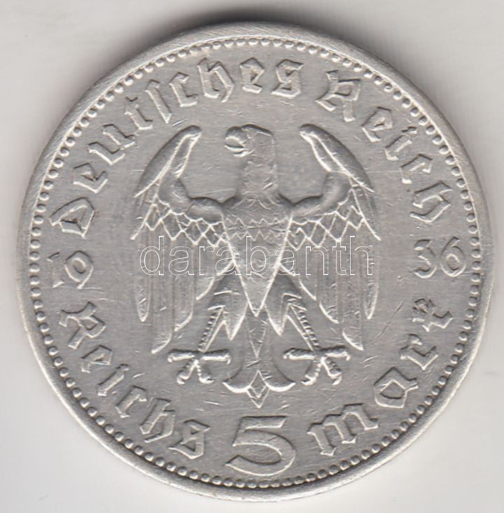 German Thir... https://www.darabanth.com/hu/203-Gyorsarveres/203.0/Numizmatika/Kulfoldi-fem-es-ezustpenzek~13/Nemet-3-Birodalom-1936F-5M-Ag-Hindenburg-T2--3Cbr3EGerman-Third-Reich-1936F-5-Marks-Ag-Hindenbu~II808474