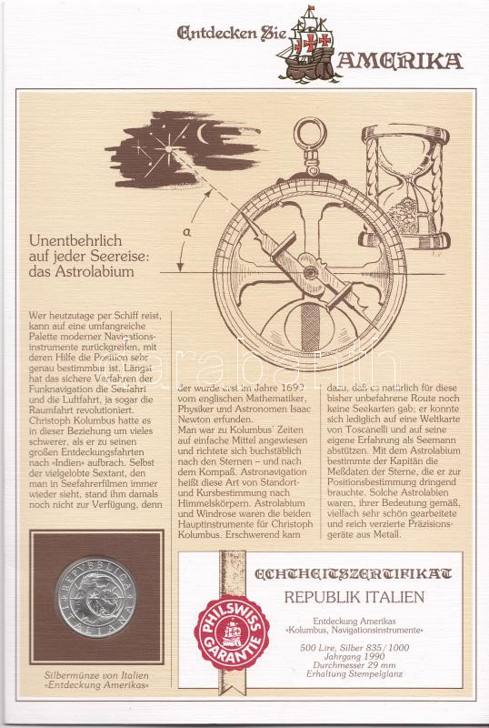 Italy 1990. 500 Lire Ag "The Exploration of Amrica" in paper case with certificate C:BU
