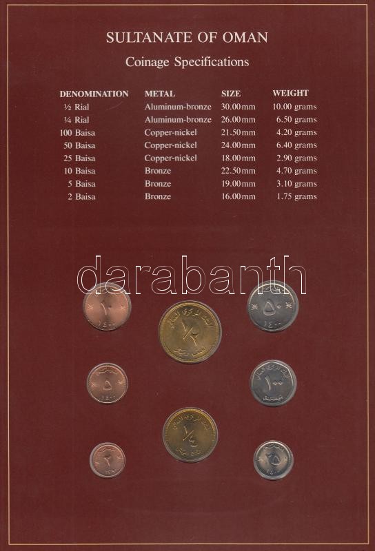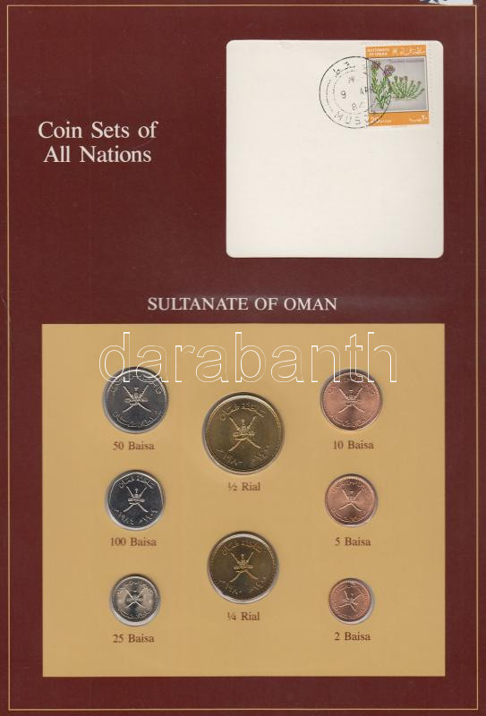 Omán 1980. 2b - 1/2R 8klf db, forgalmi szett felbélyegzett kartonlapon... https://www.darabanth.com/hu/203-Gyorsarveres/203.0/Numizmatika/Kulfoldi-fem-es-ezustpenzek~13/Oman-1980-2b--12R-8klf-db-forgalmi-szett-felbelyegzett-kartonlapon-T1-3Cbr3EOman-1980-2-baisa~II783923