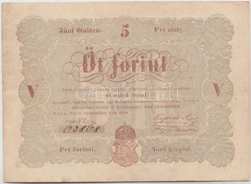 Leírás: 1848. 5Ft "Kossuth bankó" barna T:III