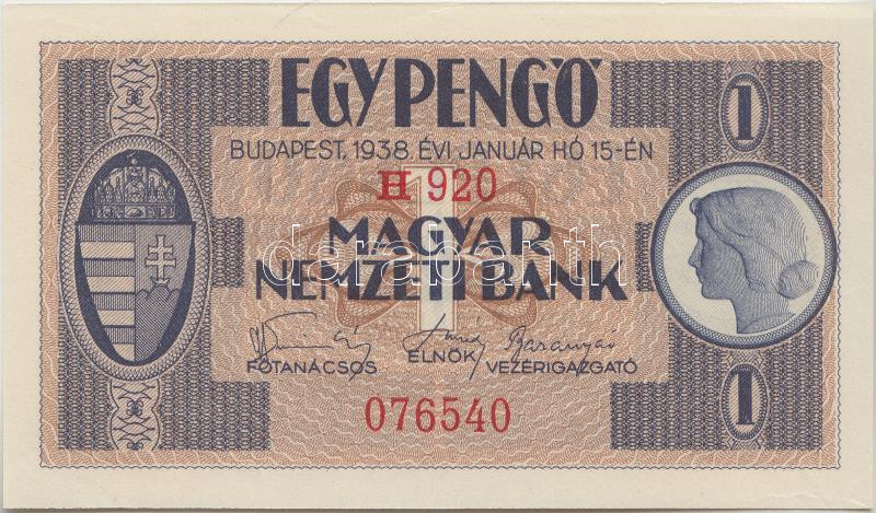 1938. 1P "H 920 / 076540" T:I https://www.darabanth.com/hu/203-Gyorsarveres/203.0/Numizmatika/Magyar-bankjegyek~8/1938-1P-H-920-076540-TI~II809735