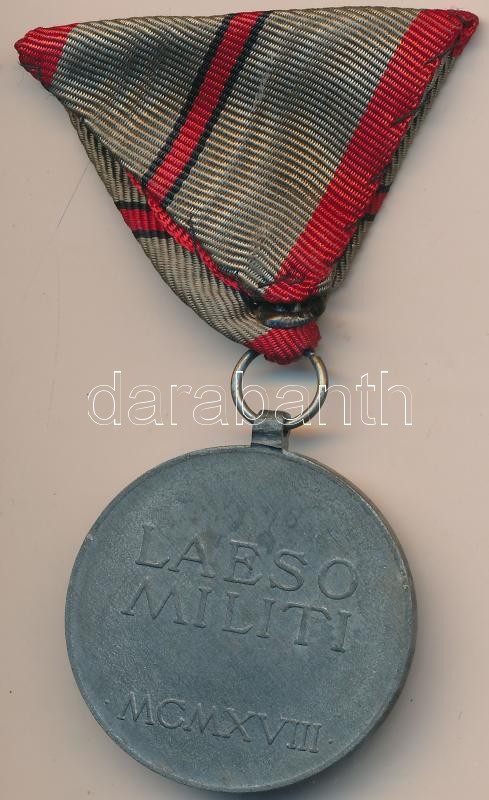 Leírás: 1918. "Laeso Militi" - Sebesültek Érme cink kitüntetés mellszalaggal. Szign.: R. Placht T:2