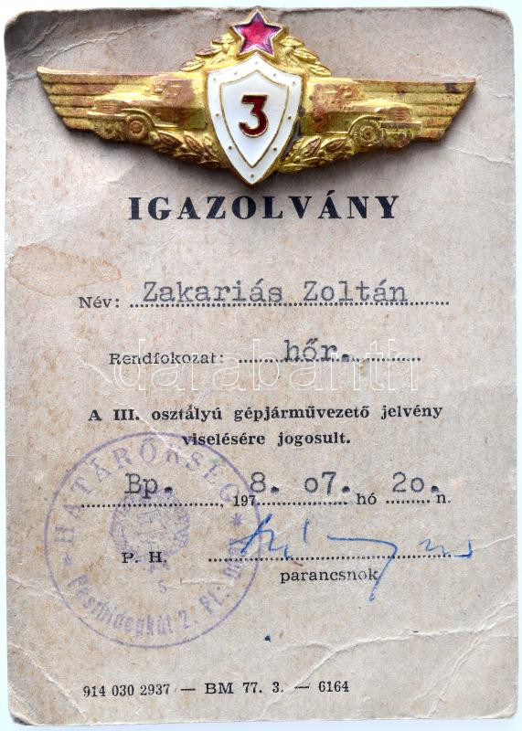 1978. III. osztályú gépjárművezető jelvény viselésre jogosító igazolvá... https://www.darabanth.com/hu/203-Gyorsarveres/203.0/Numizmatika/Militaria~16/1978-III-osztalyu-gepjarmuvezeto-jelveny-viselesre-jogosito-igazolvannyal-T2~II809944