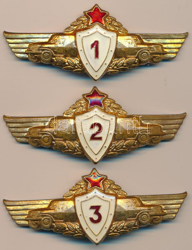 ~1970. Gépkocsizó osztályos zománcozott jelvények 1,2,3 fokozat T:1 https://www.darabanth.com/hu/203-Gyorsarveres/203.0/Numizmatika/Militaria~16/7E1970-Gepkocsizo-osztalyos-zomancozott-jelvenyek-1-2-3-fokozat-T1~II809549