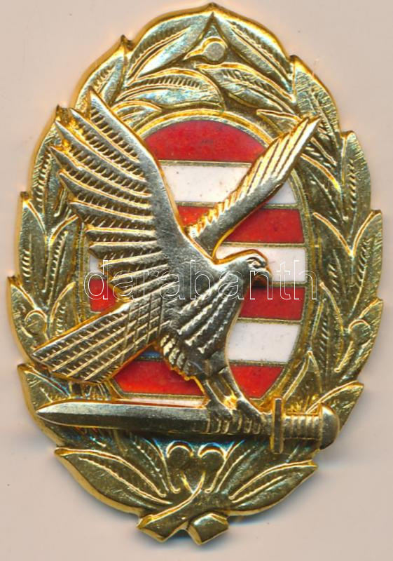 Leírás: DN Vezérkari Akadémia jelvénye, aranyozott jelvény tűzzománc piros-fehér sávos középrésszel, rajta kiterjesztett szárnyú sas karmai közt kard T:1