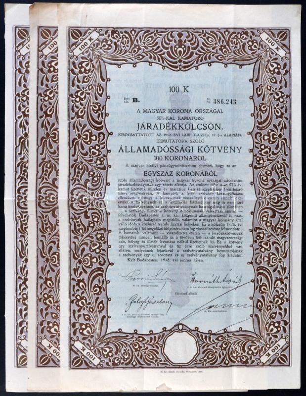 1917-1918. "A Magyar Korona Országai 6%-kal kamatozó Járadékkölcsön - bemutatóra szóló államadóssági kötvénye 100K-ról + "A Magyar Korona Országai 5 1/2%-kal kamatozó Járadékkölcsön - bemutatóra szóló államadóssági kötvénye 100K-ról (3x) T:III