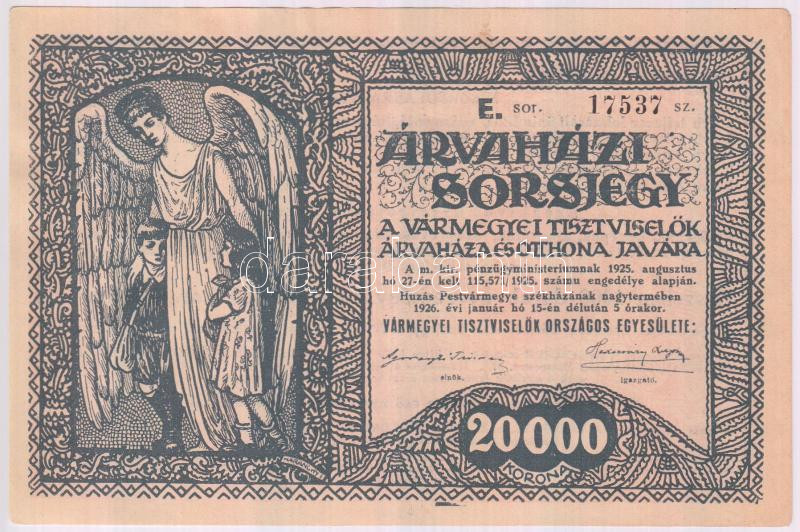 1926.január 15. "Árvaházi Sorsjegy" "E" sorozat I-... https://www.darabanth.com/hu/203-Gyorsarveres/203.0/Numizmatika/Reszvenyek-es-sorsjegyek~6/1926januar-15-Arvahazi-Sorsjegy-E-sorozat-I-II-III~II811492