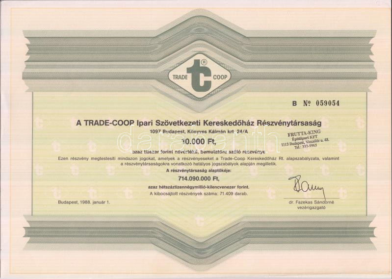 1988. Trade-Coop Ipari Szövetkezeti Kereskedőház Rt. részvénye 10.000F... https://www.darabanth.com/hu/203-Gyorsarveres/203.0/Numizmatika/Reszvenyek-es-sorsjegyek~6/1988-Trade-Coop-Ipari-Szovetkezeti-Kereskedohaz-Rt-reszvenye-10000Ft-rol-nehany-szelven~II811515