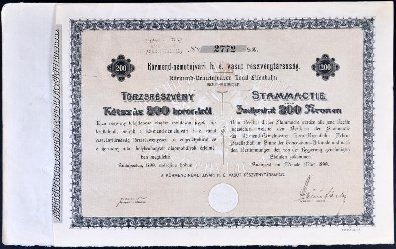 Budapest 1899. "Körmend-németújvári h. é. vasút részvénytársaság&... https://www.darabanth.com/hu/203-Gyorsarveres/203.0/Numizmatika/Reszvenyek-es-sorsjegyek~6/Budapest-1899-Kormend-nemetujvari-h-e-vasut-reszvenytarsasag-torzsreszvenye-200K-C3~II811359