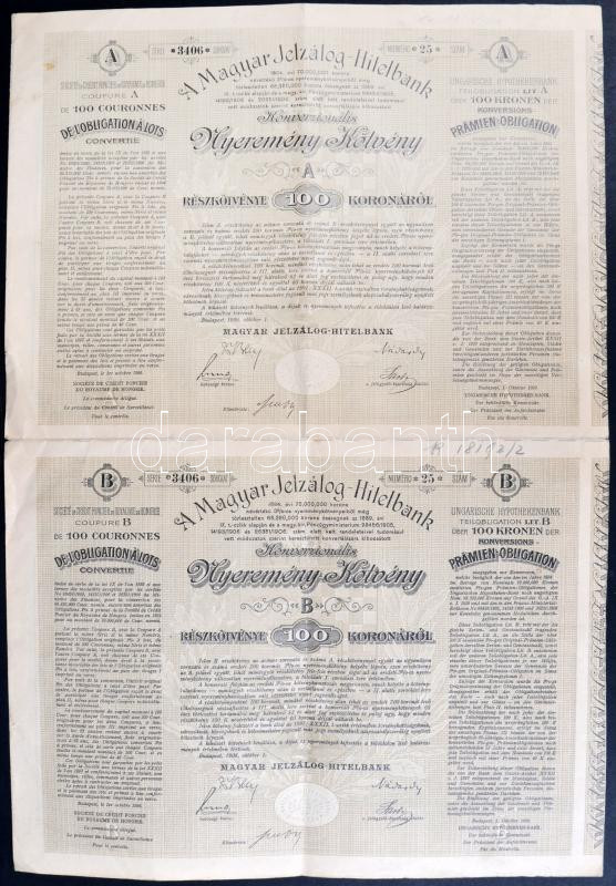 Leírás: Budapest 1906. "A Magyar Jelzálog-Hitelbank" Nyeremény-Kötvény "A" és "B" részkötvénye 100K-ról, 3 nyelven T:III