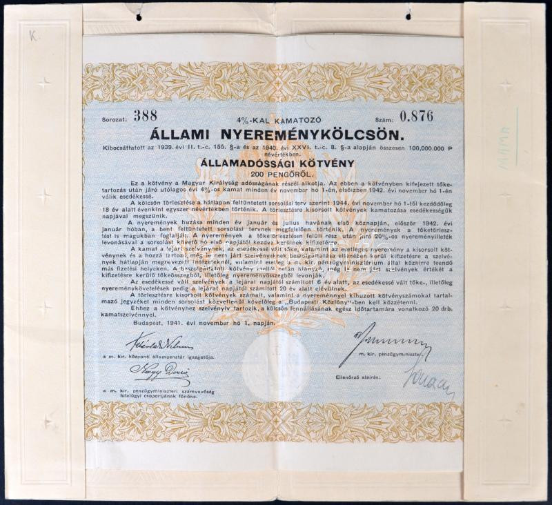 Budapest 1941. 200P "4%-kal kamatozó állami nyereménykölcsön - ál... https://www.darabanth.com/hu/203-Gyorsarveres/203.0/Numizmatika/Reszvenyek-es-sorsjegyek~6/Budapest-1941-200P-425-kal-kamatozo-allami-nyeremenykolcson--allamadossagi-kotveny-2x~II812315