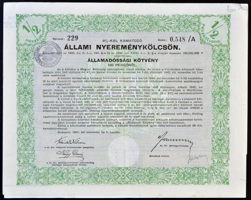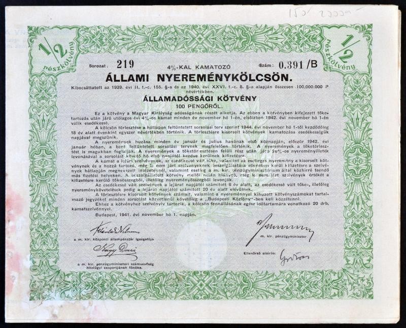 Budapest 1941. "4%-kal kamatozó állami nyereménykölcsön - államad... https://www.darabanth.com/hu/203-Gyorsarveres/203.0/Numizmatika/Reszvenyek-es-sorsjegyek~6/Budapest-1941-425-kal-kamatozo-allami-nyeremenykolcson--allamadossagi-kotveny-100P-rol~II749635