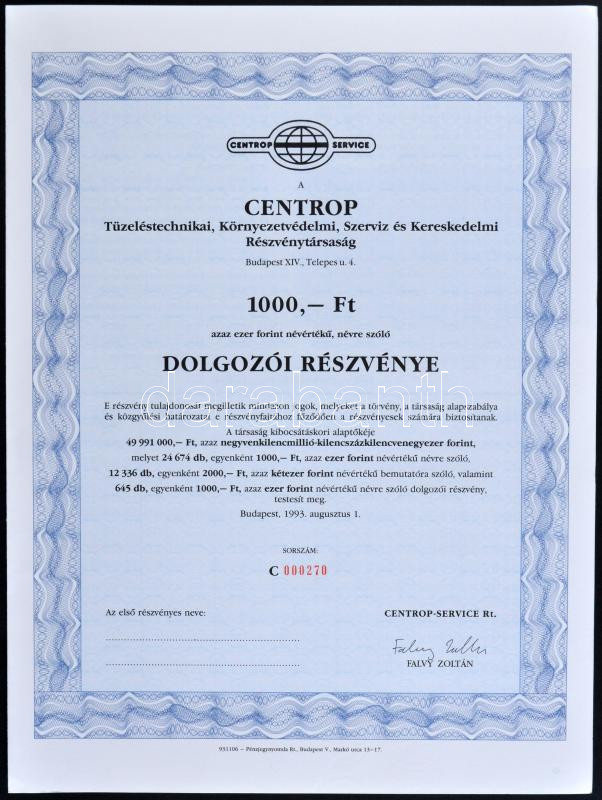 Leírás: Budapest 1993. "Centrop Tüzeléstechnikai, Környezetvédelmi, Szerviz és Kereskedelmi Részvénytársaság" dolgozói részvénye 1000Ft-ról szelvényekkel T:I-