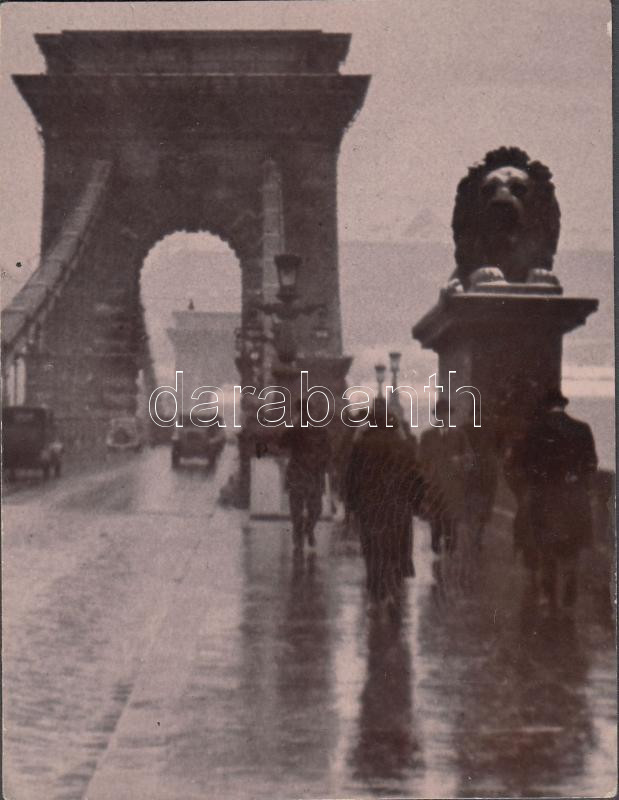 cca 1920-1930 Kerny István (1879-1963): Lánchíd, bal oldali közlekedéssel, vintage fotóművészeti alkotás brómezüst és pigment kombinációval, K. I. saját eljárása szerint, festészet utánzó stílusban, feliratozva, pecséttel jelezve, 12,5x9,5 cm