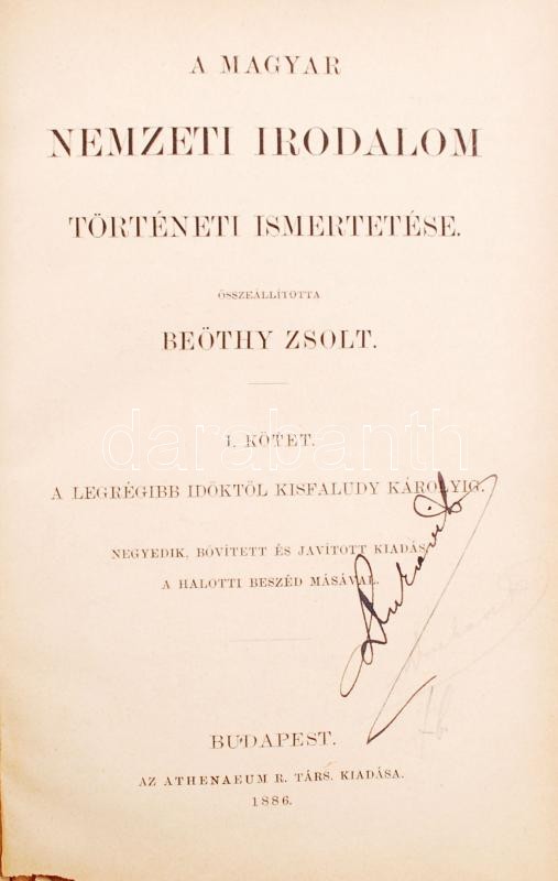 Beöthy Zsolt: A magyar nemzeti irodalom történeti ismertetése I-II. kötet. Negyedik javított és bővített kiadás. Bp., 1887, Athenaeum. Bordázott gerincű félbőr kötés, kopottas állapotban.