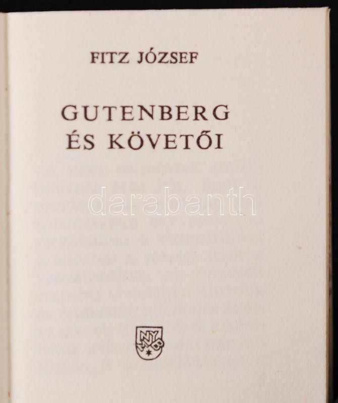 Fitz József: Gutenberg és követői. A nyomdászat dicsérete. Bp., Zrínyi... https://www.darabanth.com/hu/204-Gyorsarveres/204.0/Festmeny-mutargy-papirregiseg-egyeb/Konyvek-Minikonyvek~400036/Fitz-Jozsef-Gutenberg-es-kovetoi-A-nyomdaszat-dicserete-Bp-Zrinyi-Minikonyv-kiadoi-m~II819563