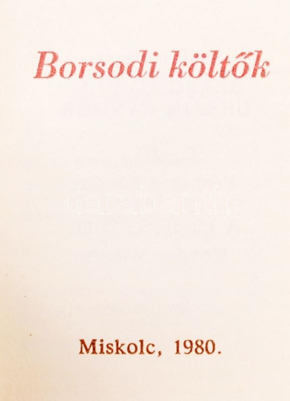 Leírás: Szabó Gyula-Urszin Sándor (szerk.): Borsodi költők. Miskolc, 1980. Minikönyv, kiadói műbőr kötés, újszerű állapotban.