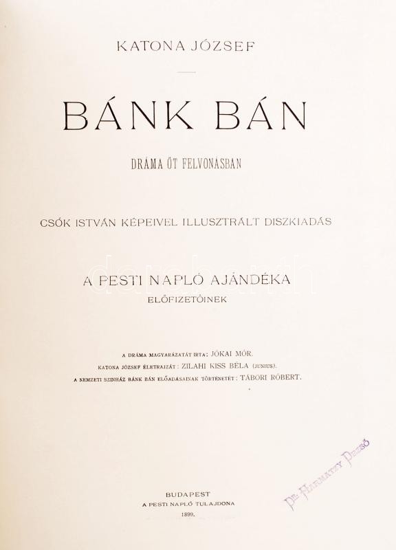 Katona József: Bánk bán. Dráma öt felvonásban Csók István képeivel illusztrált díszkiadás. A Pesti Napló ajándéka előfizetőinek. Hegedűs Geiger Richárd által tervezett borítóval. Bp., 1899, Pesti Napló. Illusztrált, kiadói aranyozott, festett egészvászon kötés, nagyon szép állapotban.