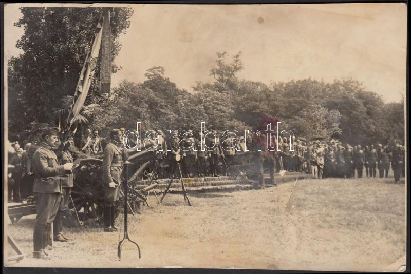 Leírás: 1932 Schäffer: Katonai fotó, avatási ünnepség, a tisztikarban Horthy Miklós (kezében fehér tányérsapka), 11x17 cm, felületén törésvonalak, lila folt.