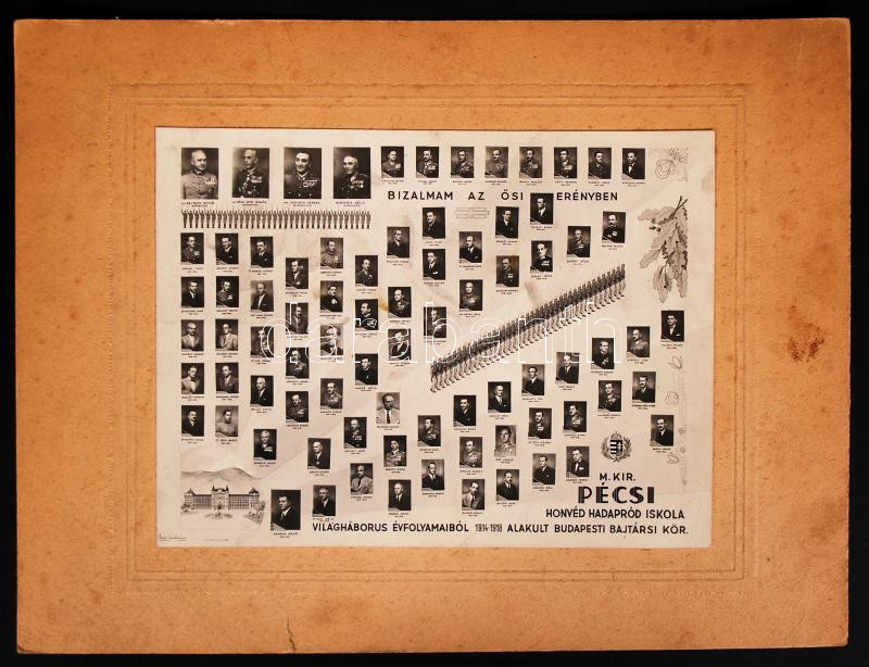 cca 1940 "Bizalmam az ősi erényben" - A M. Kir. Pécsi Honvéd Hadapród Iskola világháborus évfolyamaiból (1914-1918) alakult budapesti bajtársi kör. Tablókép 80 portréval, nevekkel, kitüntetésekkel, kartonra kasírozva, 16x22cm (25x33cm)