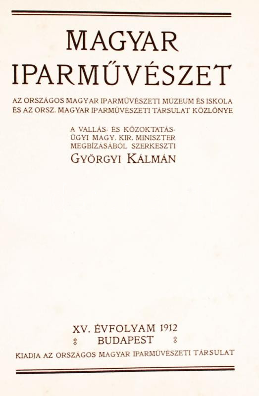 1912 Bp., Magyar Iparművészet, Az Országos Magyar Iparművészeti Múzeum és Iskola és Az Országos Magyar Iparművészeti Társulat közlönye, XV. évfolyam, valamint a Társulat Választmányának jelentése a Társulat 1911. évi működéséről (241-320. o. között hiányos), 388p.