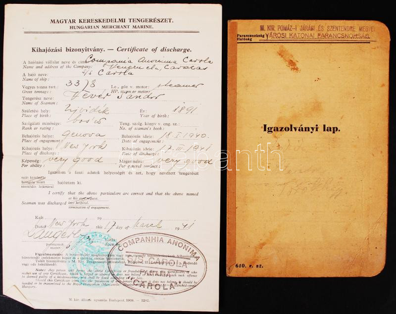 Leírás: 1939-1941 Szentendre, New York, Kereskedelmi tengerész igazolványi lapja és kihajózási bizonyítványa