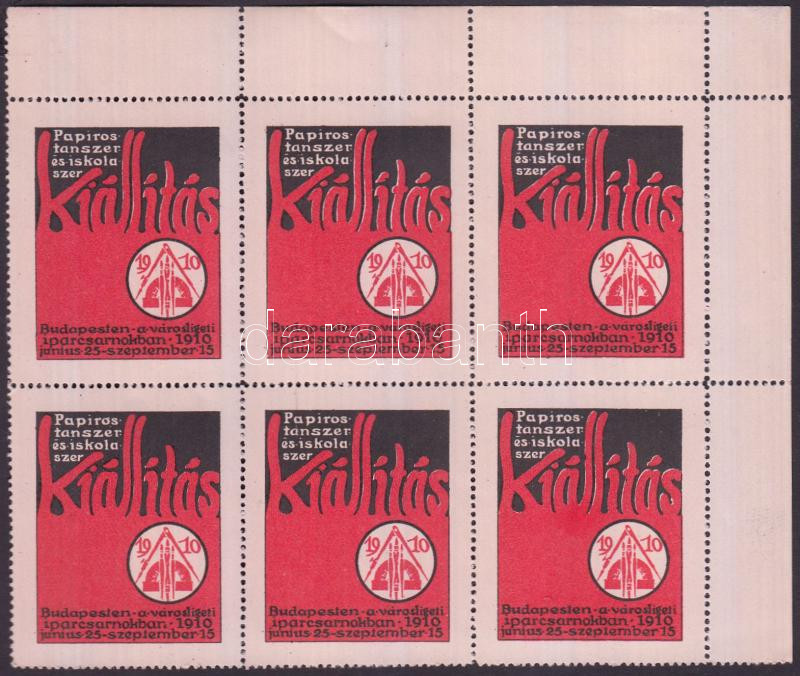 1910 Iskolaszer kiállítás ívsarki hatostömb https://www.darabanth.com/hu/204-Gyorsarveres/204.0/Festmeny-mutargy-papirregiseg-egyeb/Parafilatelia~400012/1910-Iskolaszer-kiallitas-ivsarki-hatostomb~II815552