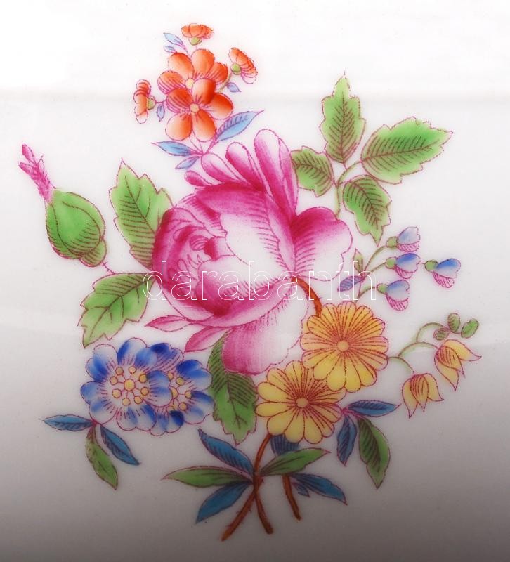 Leírás: Herendi, virágmintás leveses tál, jelzett, kézzel festett, apró lepattanások a rózsákon, 28.5×20 cm, m:24 cm