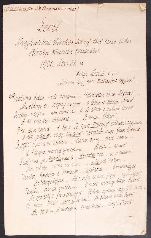Leírás: 1900 Ócsa, Szabó Géza lelkész által írt levél Farkas József teológiai tanárhoz királyi kitüntetése alkalmából