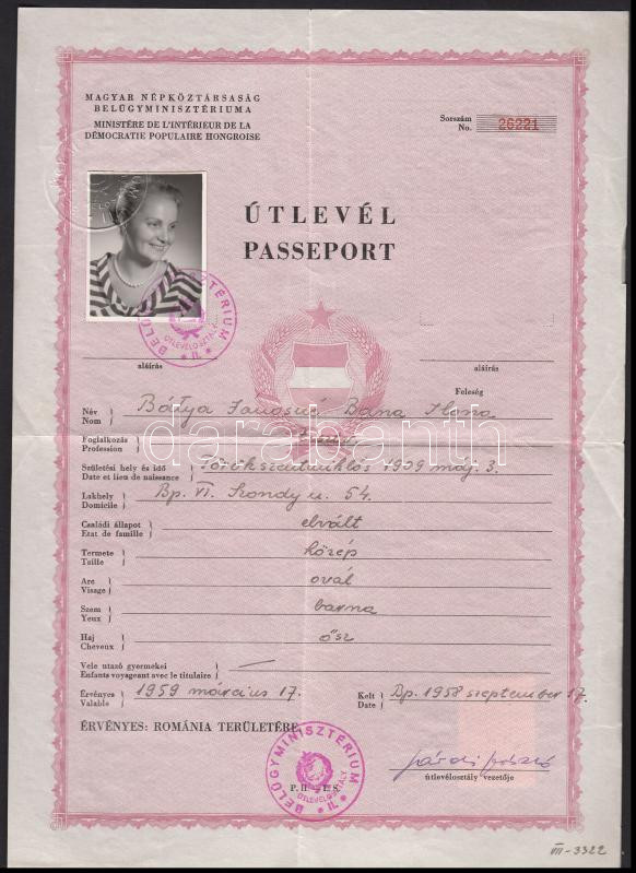 1959 Magyar Népköztársaság Belügyminisztériuma által kiállított útlevé... https://www.darabanth.com/hu/205-Gyorsarveres/205.0/Festmeny-mutargy-papirregiseg-egyeb/Okmanyok~31/1959-Magyar-Nepkoztarsasag-Belugyminiszteriuma-altal-kiallitott-utlevel-Romaniaba--3Cbr~II826810