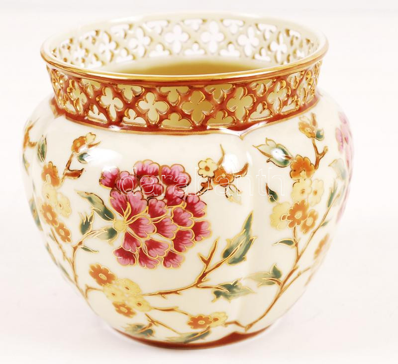 Leírás: Zsolnay porcelán áttört, kézzel festett virágmintás kaspó, hibátlan, jelzett, m: 10 cm, d: 9 cm /