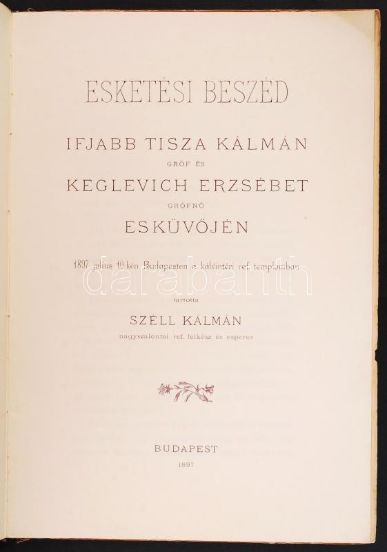 Leírás: 1897 Esketési beszéd ifj. Tisza Kálmán gróf és Keglevich Ilona grófnő esküvőjén... 10p.