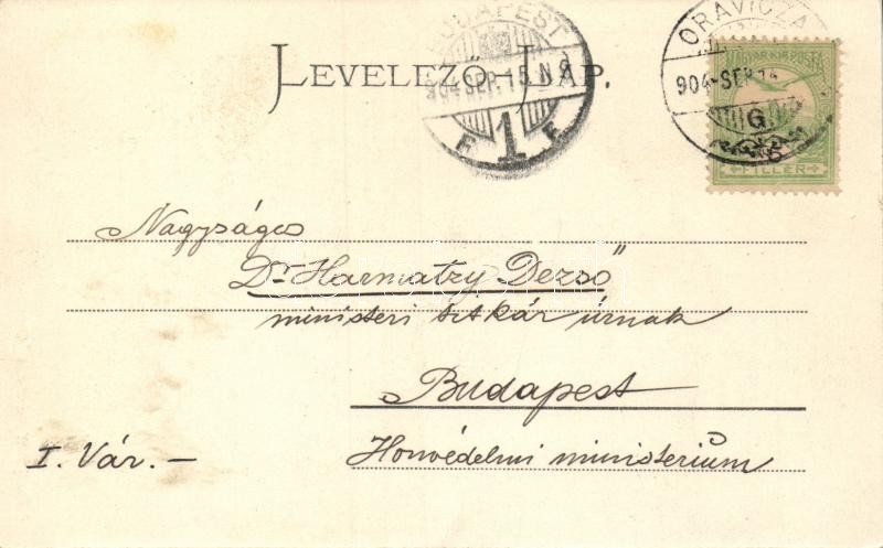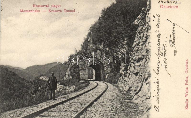 Leírás: Oravica, Krassova, Montanbahn, tunnel / Dr. Harmatzy Dezső miniszteri titkárnak címzett képeslap, Weisz Felix kiadása