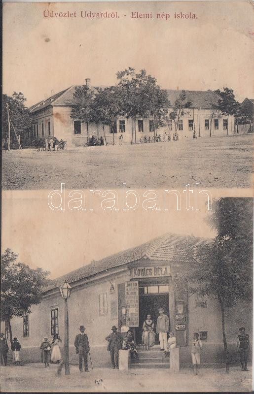 Leírás: Udvard, Elemi népiskola, Kovács Béla üzlete / school, shop (EB)