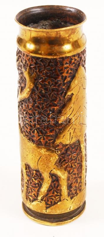 Leírás: Ágyúhüvelyből készített szarvasos emlékváza, réz, m:14 cm