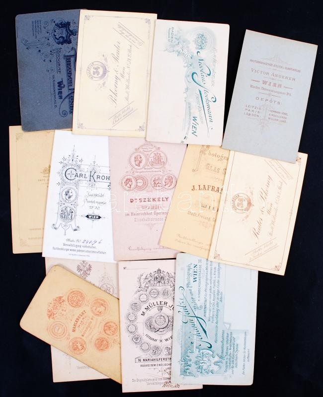 Leírás: cca 1870-1920 Fotótörténeti leletek bécsi műtermekből 13 db keményhátú fotó, 10x6 cm