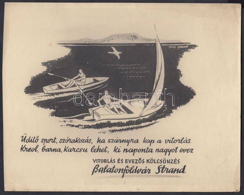 cca 1930-1940 Gönczi-Gebhardt Tibor (1902-1994) grafikusművész balaton... https://www.darabanth.com/hu/206-Gyorsarveres/206.0/Festmeny-mutargy-papirregiseg-egyeb/Foto~10022/cca-1930-1940-Gonczi-Gebhardt-Tibor-1902-1994-grafikusmuvesz-balatonfoldvari-reklam-grafika~II828531