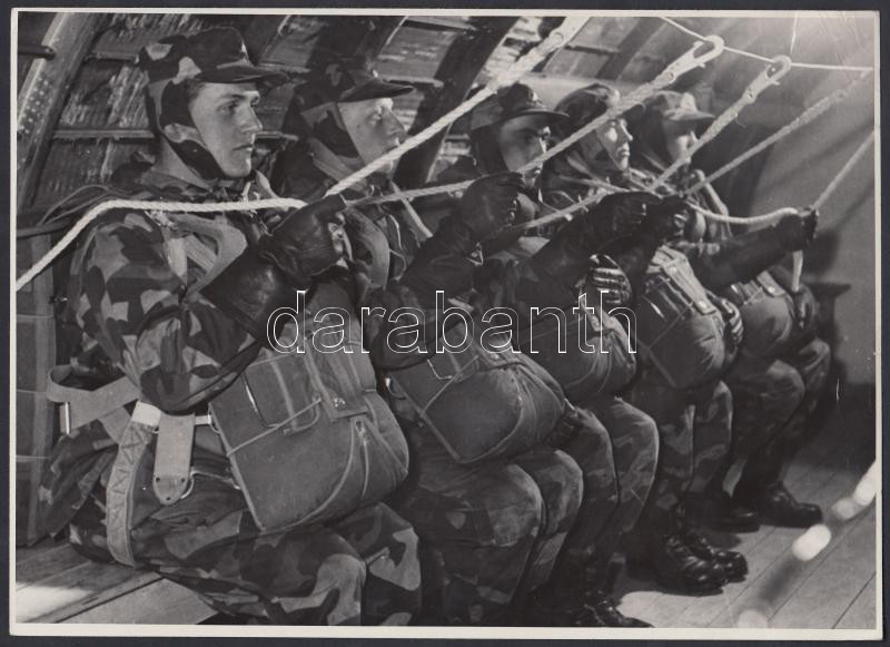 Leírás: cca 1970-1980 Cseh ejtőernyősök a repülőgépen, ugrásra készen, a Néphadsereg című lap archívumából, apró szakadással, 17x23 cm