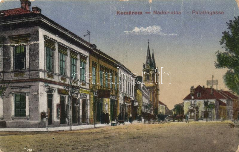 Leírás: Komárom, Nádor utca / street, church, shops (fa)