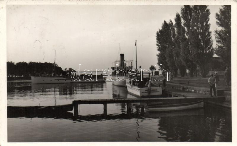 Leírás: Balatonboglár, kikötő, Vármegyék és városok Országos Mentőegyesületének hajója, gőzhajó, csónak