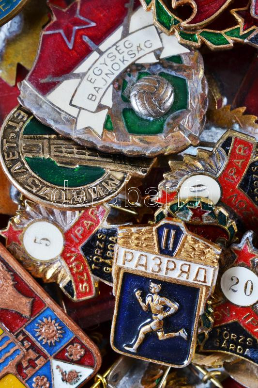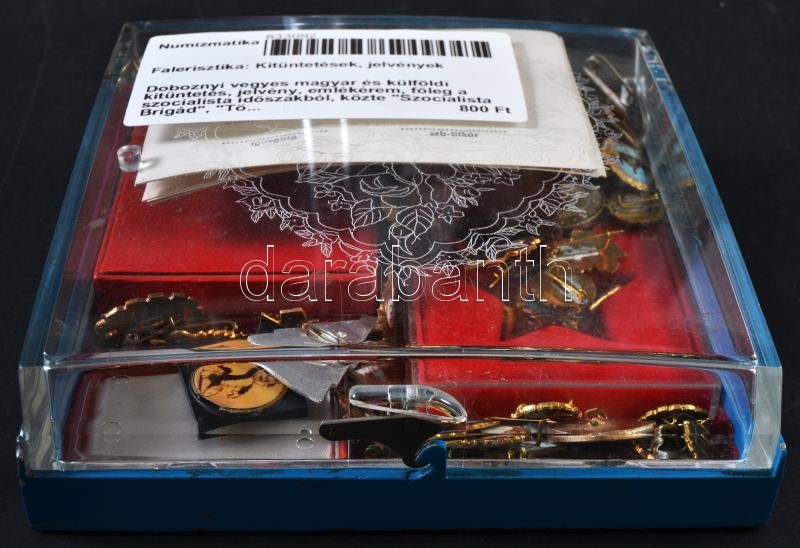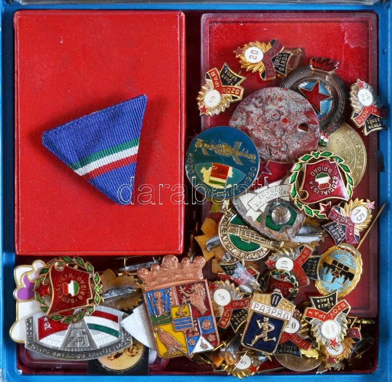 Doboznyi vegyes magyar és külföldi kitüntetés, jelvény, emlékérem, főleg a szocialista időszakból, közte "Szocialista Brigád", "Törzsgárda" jelvények kitöltetlen igazolványokkal, zománcozott és tokos darabok is T:vegyes
