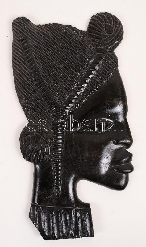 Leírás: Afrikai alakot ábrázoló ébenfa faragvány, falra akasztható, m:36 cm, sz:17 cm.