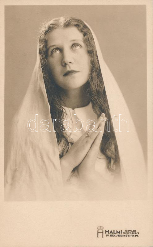 Halmi Béla fotóján Hölgy Szűz Máriaként Fotólap, nem futott, 8,5x13,5 ... https://www.darabanth.com/hu/207-Gyorsarveres/207.0/Festmeny-mutargy-papirregiseg-egyeb/Foto~600018/Halmi-Bela-fotojan-Holgy-Szuz-Mariakent-Fotolap-nem-futott-8-5x13-5-cm~II842658
